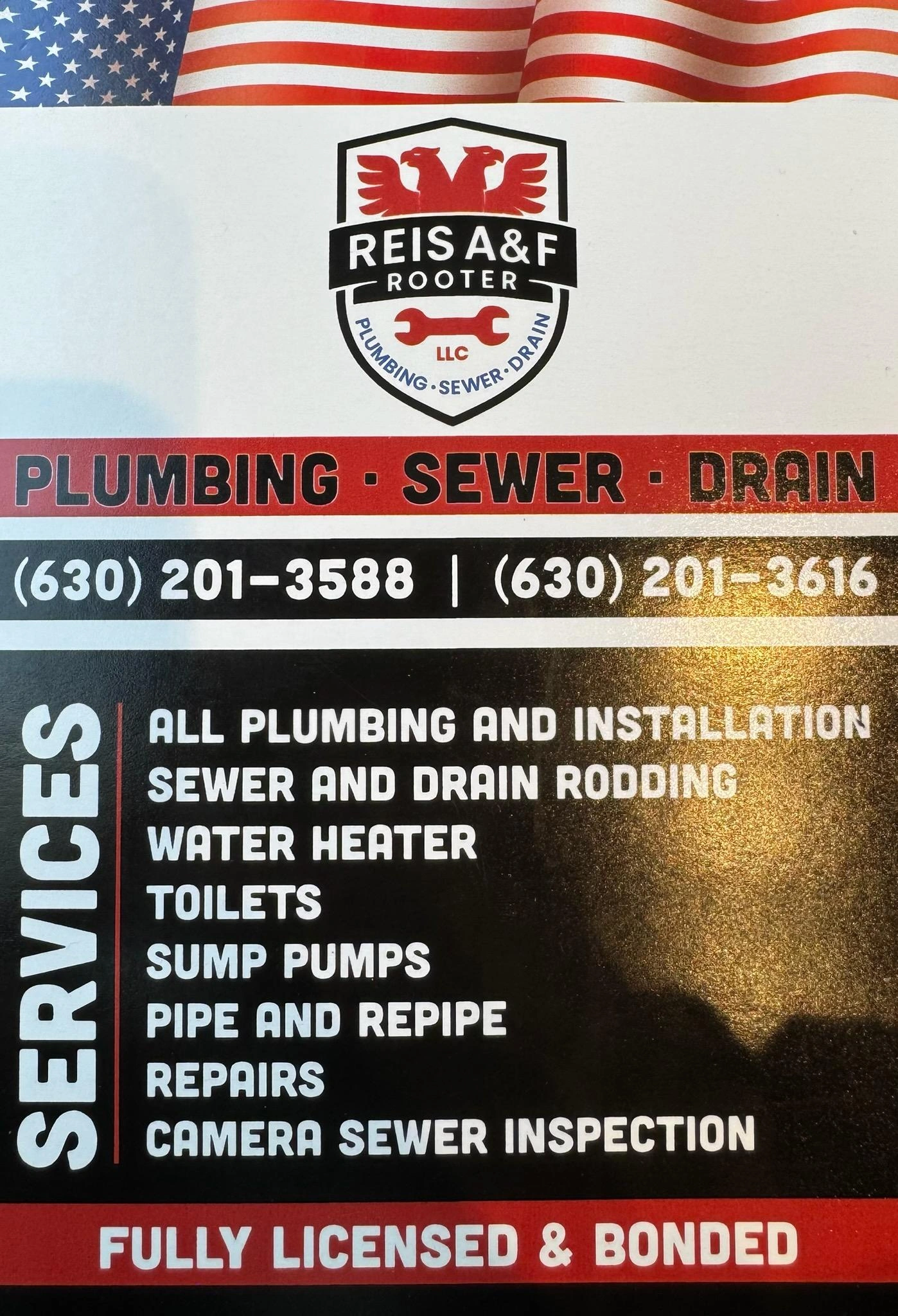Reis A&F Rooter LLC provides professional plumbing services to residential and commercial customers throughout the west suburbs and surrounding areas. We specialize in water heater repair and installation, clogged drains and sewer lines, camera inspections, pipe repairs, pumps, toilets, faucets, fixture installations, and 24/7 emergency plumbing services.